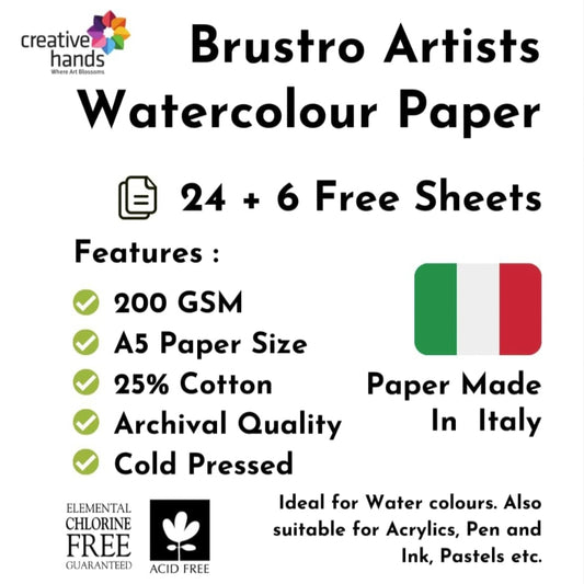 Brustro Artists Watercolour Paper 200 GSM A5-25% Cotton Cold Pressed 24+6 sheets