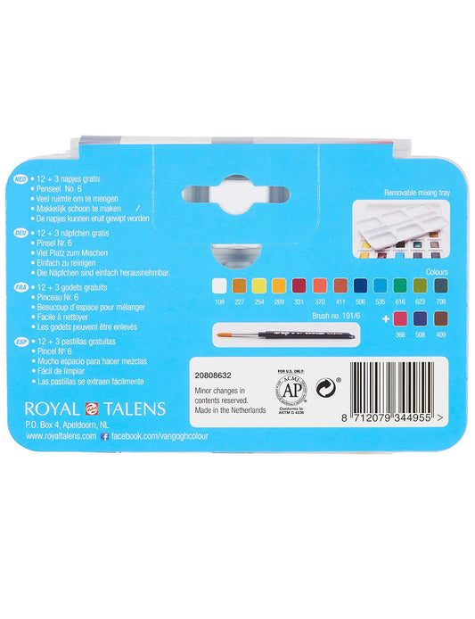 Vangogh Pack Of 12 Watercolors + 3 Pocket Box + Brush # 6 - Water Color Box Hp8631+3 - Artist Portable Watercolour Set Of 15 Colors