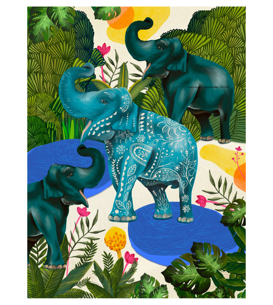 Elephants Together Wall Art Print | Family of Elephants Artwork | Colorful Wildlife Jungle Illustration Decor