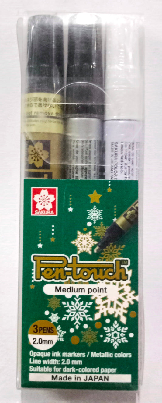 Sakura Pen-touch Permanent Markers - Pack of 3 markers - Gold, Silver & White (Medium Point, 2.0 mm)