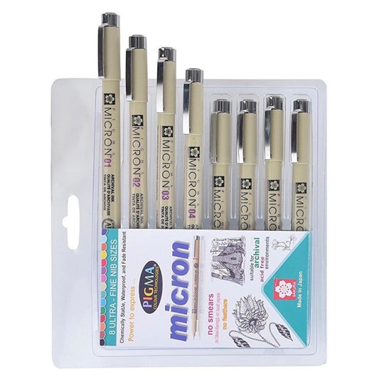 Sakura Pigma Micron Fine Line Pens - Set Of 8 Assorted Nibs In Black Colour (003,005,01,02,03,05,08 And Pn Tip)